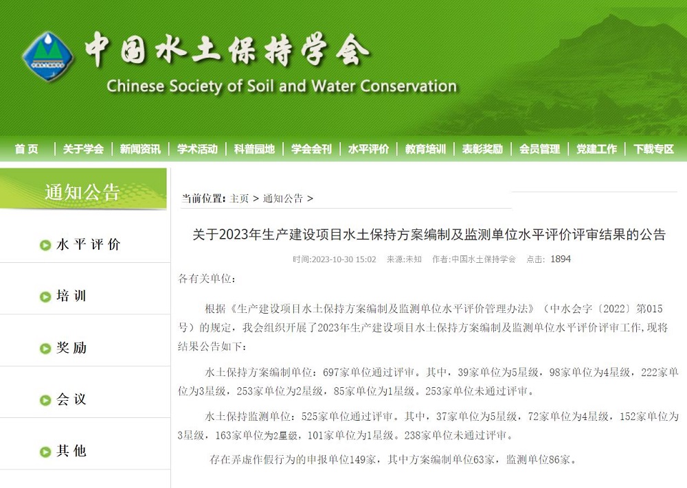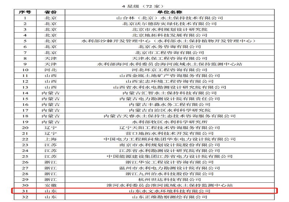 10月30日,中國(guó)水土保持學(xué)會(huì)發(fā)布了關(guān)于2023年生產(chǎn)建設(shè)項(xiàng)目水土保持監(jiān)測(cè)單位水平評(píng)價(jià)評(píng)審結(jié)果的公告,山東水文水環(huán)境科技有限公司被評(píng)為2023年生產(chǎn)建設(shè)項(xiàng)目水土保持監(jiān)測(cè)單位水平評(píng)價(jià)4星級(jí)(滿5星)單位。此次證書成功升級(jí),是水文科技公司水土保持專業(yè)人才隊(duì)伍和技術(shù)能力建設(shè)成效的結(jié)晶,對(duì)提升公司品牌影響力和市場(chǎng)競(jìng)爭(zhēng)力具有重要意義。